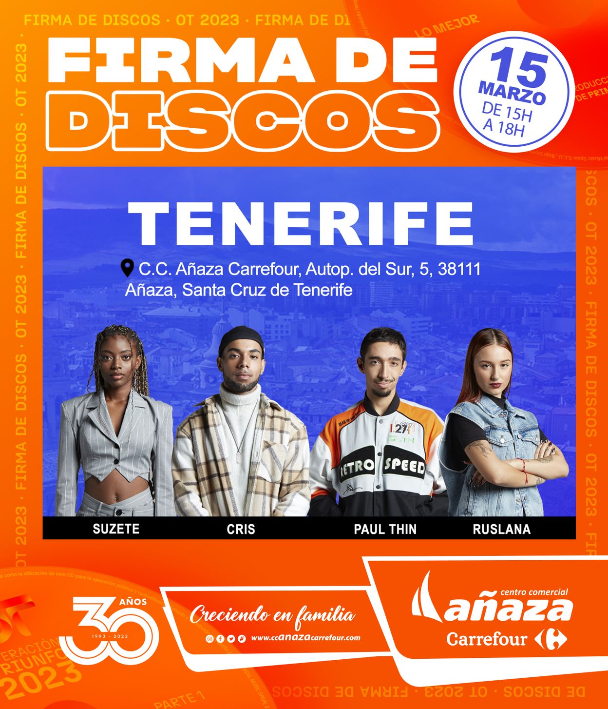 ¡No te pierdas la Firma de Discos 🎶 de OT 2023 el 15 de marzo en el Centro Comercial Añaza Carrefour, de 15:00 a 18:00 hrs! 😃